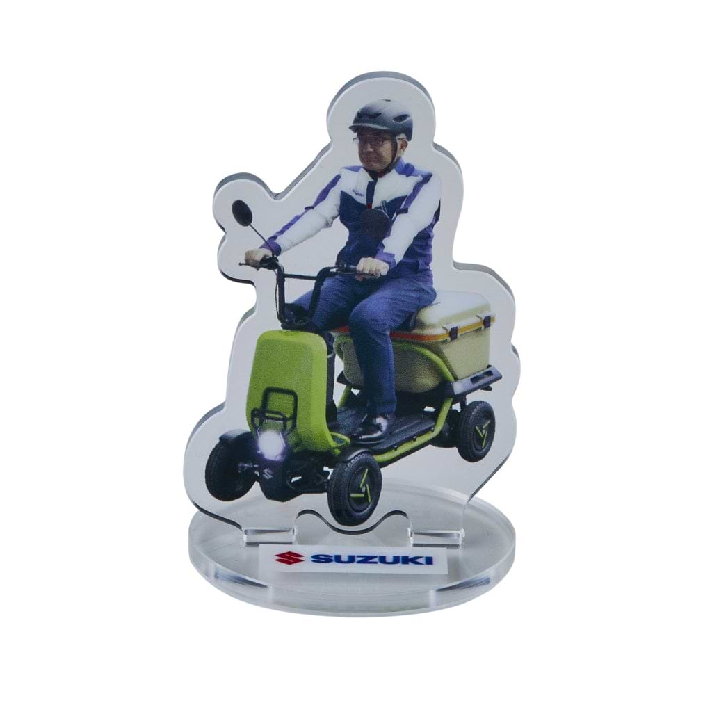 スズキの新ユニフォームを身にまとい「スズライド」を運転している、スズキ株式会社 代表取締役 鈴木俊宏社長のアクリルスタンドです。
