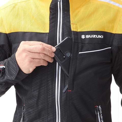 SUZUKI×KUSHITANI コラボフルメッシュパーカージャケットはスプレット柄エンボスとスラブ柄エンボスを採用し新デザインのフルメッシュパーカージャケットです。左胸には大型ポケットを採用しております。走行中にフードのバタつきが気になる場合は、バタつき防止ループをご使用ください。また、フロントダブルファスナー仕様を採用していますので、状況に応じてサイズ調整が可能です。