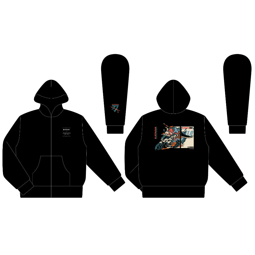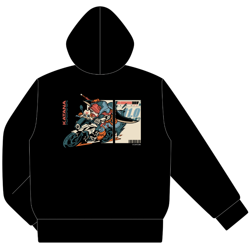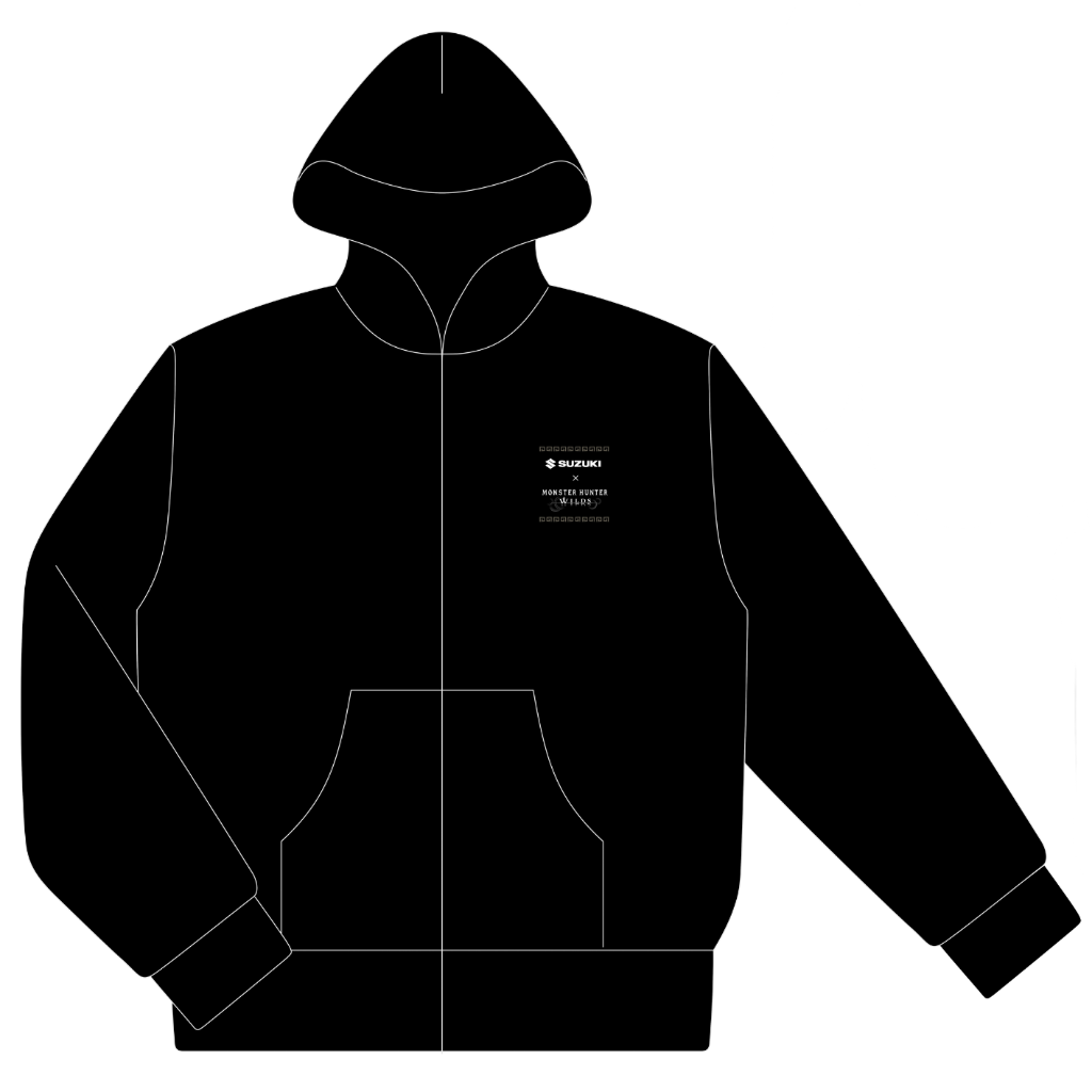 カプコンの人気ゲーム『モンスターハンター』とスズキがコラボレーションした限定ジップアップパーカーです。「もし、モンスターハンターの世界にSUZUKIがあったら」というテーマに基づき、スズキの社内デザイナーが書き下ろした冒険心をくすぐるデザインが特徴です。